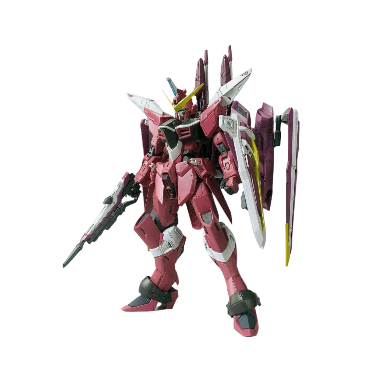From the TV series "Gundam Seed", the Justice Gundam has finally been made into a Master Grade kit! Justice Gundam's multipurpose sublifter with movable beam cannons and machine cannons, the Fatum-00, can be configured into different flight positions on back and also as a flying mount for it to stand on. Pair with MG Freedom 2.0 and MG Providence to complete ZAFT's Gundam Seed lineup! Includes two beam boomerangs that be stored in shoulders, two beam saber, beam rifle, and Laminate anti beam shield.ย