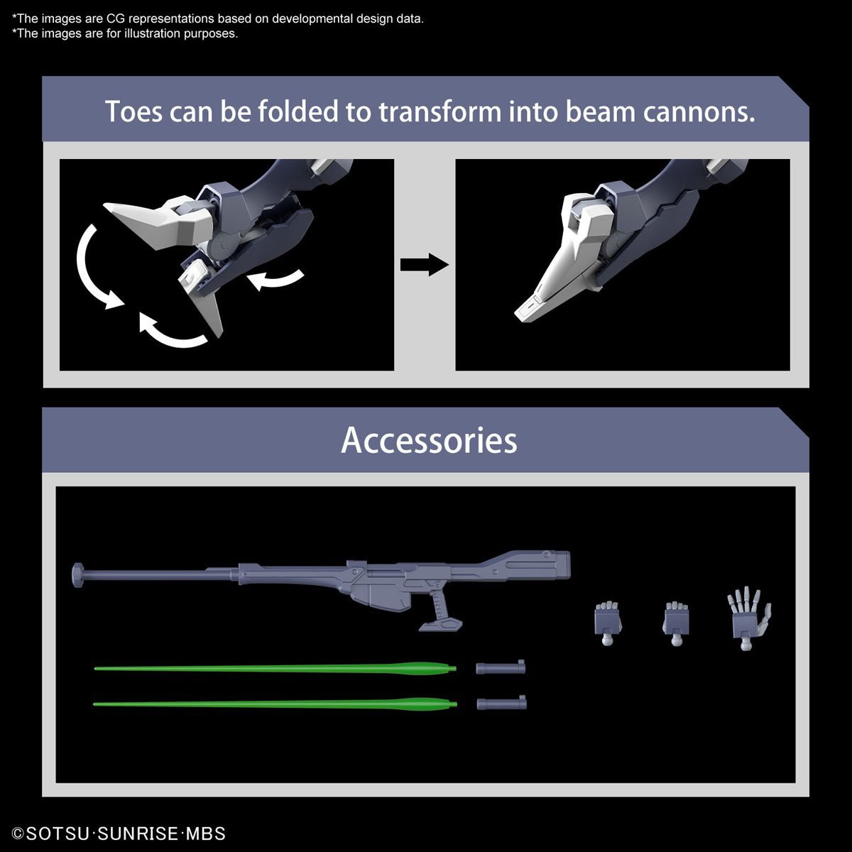 1x Large Beam Rifle, 2x Beam Sabers, 1x set of alternate hands, and 1x sticker sheet. Build, display, and add this enthralling model kit to your collection!