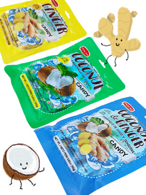 Get Pocas Ginger & Coconut candy. This is made from real coconut & ginger ! With satisfying spiciness and sweet coconut flavor, you can enjoy this delicious treat for nausea, upset stomach, morning sickness, or anytime you have a sweet tooth.