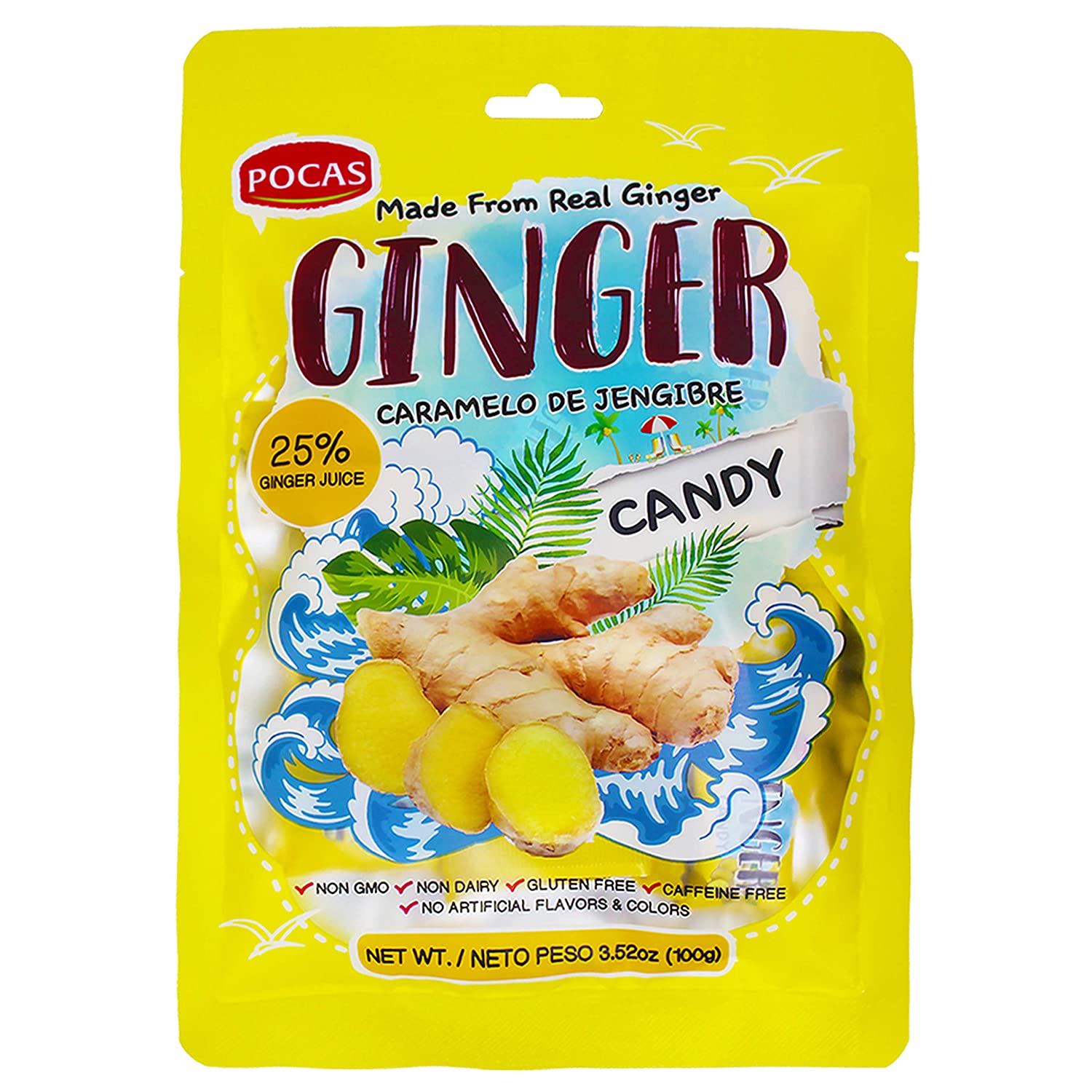 Get Pocas Ginger & Coconut candy. This is made from real coconut & ginger ! With satisfying spiciness and sweet coconut flavor, you can enjoy this delicious treat for nausea, upset stomach, morning sickness, or anytime you have a sweet tooth.